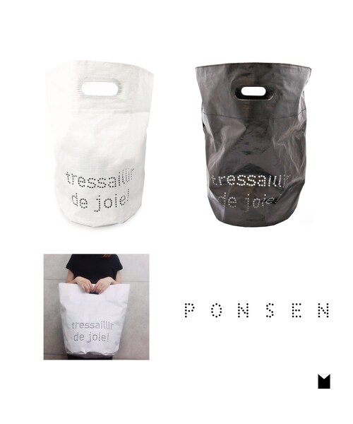 ランドリーバッグとしても使えるバケツバッグLには、フランス語で【嬉しくてワクワクする!】という意味のメッセージがパンチングされています。 キャンプなどのレジャー・温泉バッグ・衣類収納にもオススメです。 素材:ポリエチレン サイズ:約w30*h43*d30cm 重さ:約140g 色:白/黒