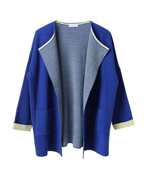 パッと目を引くブライトカラーが、コーデに明るい彩りをプラス!ソフトで肉厚のニットソーで仕立てたジャケットです。ラフに羽織るだけでサマになる、ドレーピーなフロントデザインがスタイリッシュ◎袖口やネック内側の配色使いが、メリハリ感演出のキーポイントに。ロング丈の存在感あるデザインは、着こなしのアクセントにも映えるはず。