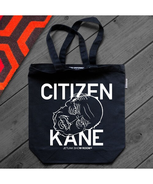 JETLINKでどれでも3点のお買物で、映画「市民ケーン」をモチーフにした特製トートバッグ(非売品)を無料プレゼントさせていただきます。 Item: CITIZEN KANE -Power Collapse- Tote Bag Color: オールドブラック生地×水性ホワイト Size: 360mm×360mm 【デザインの解説】 1941年に公開されたフィルムノワールの金字塔、映画『市民ケーン』より。主人公で新聞王チャールズ・フォスター・ケーンの権力崩壊-Power Collapse-をテーマに、今作のトートバッグ用に新規デザインしました。 【帆布生地の解説】 トートバッグに使用した帆布生地(キャンバス生地)は重さ12oz、ガッチリと編み込まれた堅牢なキャンバス製です。全長36cmの大容量サイズのバックです。長く使い込む程に色落ちして、高品質な帆布生地ならでは経年変化をお楽しみいただけます。 【ノベルティ商品の限界に挑戦!】 今作でも無料配布用のノベルティ商品の扱いではありながらも、東京下町~日本各地のメイド・イン・ジャパンが誇る職人技術を駆使して作り込みの限界まで挑戦しています。(ワッペンの緻密な刺繍(ししゅう)技術、トートバッグの高品質な帆布素材へのこだわり、トートバッグの特殊蓄光プリントの発色にもこだわり、専用の製版と刷り台も増設しました)JETLINKならではの高品質なノベルティアイテムをお楽しみください。