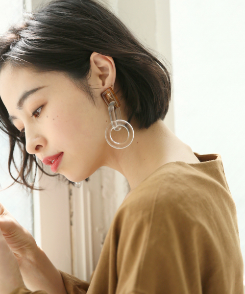 LOWRYS FARM大人気!!大ぶりイヤリング 大人気クリア素材のイヤリングが入荷しました!! 清涼感があり、大ぶりで存在感のあるパーツが印象的なイヤリング。 さり気なく揺れる女性らしいデザインなので、カジュアルはもちろん大人めにも楽しめるピアスです。 季節問わず使えるデザインなので使いやすく、シンプルなスタイリング時におすすめです♪ ■ヘアアレンジおすすめ■ 大ぶりなシルエットなので、ダウンヘアースタイルでもチラッと見えます。 ポニーテールやハーフアップなどのアレンジスタイルで、ピアスを主役におしゃれを楽しんでみてください♪