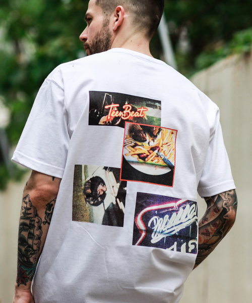 米綿100%の糸で丸胴編み(脇はぎの無い)で仕上げた7オンスのヘビーウェイトなTシャツ。MR.OLIVEが撮影したビジュアル写真の中でTEEN BEATをテーマとしたフォトをコラージュデザインでプリントしたTシャツ。フロントロゴは刺繍。インパクトのあるアイテム。洗いにも強く型崩れしにくいガシガシ着れるタフなアイテム。