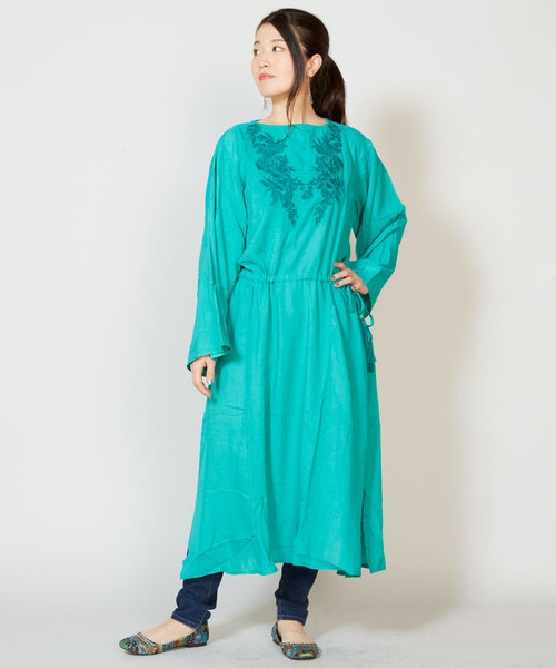 胸元にたっぷり入った花刺繍が女性らしさを引き立てるワンピース。落ち感のあるレーヨン素材でキレイなシルエットが実現しました。左サイドに入ったタッセル付きストリングでウエストにギャザーを寄せられますので、お好みのシルエットをお楽しみください。サイドスリットが深めに入っていますので、ワイドパンツやデニム、ロングスカートとのコーディネートがおすすめです。大人なフォークロアスタイルに◎※こちらの商品は1点1点職人による手作りとなります。その為、形や色合い・模様など若干異なる場合がございます。あらかじめご了承ください。※屋外での撮影画像は、光の当たり具合で色味・カラーが違って見える場合がございます。商品のカラーは、スタジオ撮影の画像をご参照ください。Amina Collection Co.,LTD.