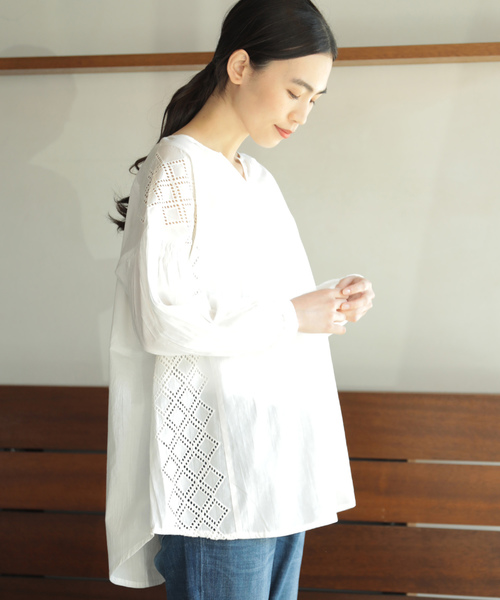 薄手のやわらかなコットン素材に、幾何学模様のレースをたっぷりとあしらった大人ガーリーなチュニック。ゆったりとしたシルエットに、ボリューミーな袖フォルムがリラックスムードを盛り上げ、抜け感のある着こなしに。長めの着丈は気になる腰まわりをカバーし、着痩せ効果も期待できます。