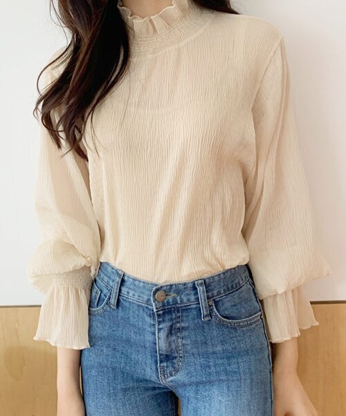 プチプラ¥2,380!ハーフネックで高さを出した上品なブラウス。 袖口は絞り処理でトレンド感もプラス!透け感が涼し気な一枚です。 ※WEARに記載してある金額と、DHOLIC通販サイトに記載してある金額にシステム都合上、稀に誤差が生じます。正しい金額はDHOLIC通販サイトに記載された金額です。