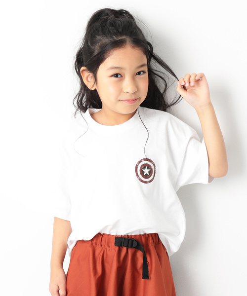 MARVEL キャプテンアメリカ 『アメコミBIGシルエットTシャツ』 キャプテンアメリカのアメコミデザインが インパクトのあるdevirock完全オリジナルTシャツ。 ヴィンテージ感のあるプリントがこなれ感を演出してくれます。 綿100%だから肌触り・通気性の良いさらっとした着心地で 汗の吸収・発散性に優れており型崩れしにくいのもポイント。 キッズからジュニアまでをカバーする 100cm~160cmまでの豊富なサイズ展開になっています。 スミクロは、ヴィンテージ感のある風合いを出すために 『着抜(ちゃくばつ)プリント※』という技法を用いています。 その為、生地の裏側には脱色のあとが見られますが、品質に問題はございません。 ※生地の色を抜きながらプリントカラーを定着させるプリント技法です。 ■ディティール■ 伸縮性:あり ・首周りは伸びにくい縫製