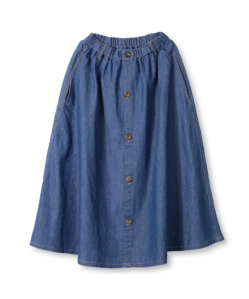 幅広いコーディネートに使えるデニムスカートです。前ボタンのデザインがアクセントとなっており、フレアスカートにすることでカジュアルな中にも女の子らしさをプラスしています。