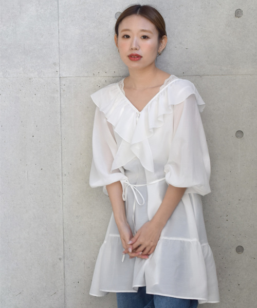 とびきりガーリーな春ワンピ今季注目のミニワンピを、フリルたっぷりのガーリーなデザインで仕上げた1着。きれいに広がるAラインは取外し可能な共布リボンで異なったシルエットをお楽しみいただけます。6分丈のふわっと広がるボリューム袖はどこかヴィンテージムード漂う雰囲気に。上品な光沢感のある生地感がレディライクな、春にぴったりのワンピースです。スタイリングほどよい透け感とミニ丈で、レイヤードスタイルが楽しいアイテム。レギンスやメローパンツを重ねたリラックススタイルがおすすめ。Vネックなのでレースインナーをちら見せするとよりガーリーな雰囲気になって◎。甘すぎないよう、足元はスニーカーやサンダルでアクティブに。【お買いものにおすすめの便利機能!】★商品のお気に入り登録完売カラーの再入荷の時や、ラスト1点の時、セールになった時にお知らせします。★ブランドのお気に入り登録新商品や再入荷、セール情報など、いち早くブランドのお得な情報を受け取ることができます。ぜひご活用ください!