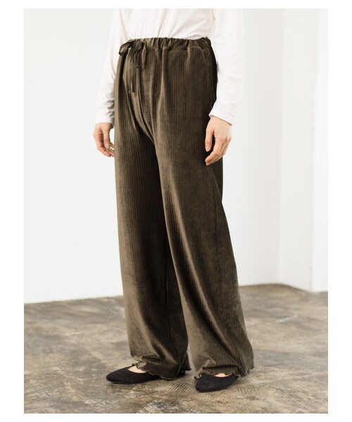 品よく光沢を放つ人気のべロア素材がシーズンムードを盛り上げるワイドパンツです。 リブの編み目が凹凸の表情を作り上げ、コーデュロイ素材のような見た目に技アリの一枚。 ウエストは総ゴムなので、ストレスなく、楽ちんに着れるのが嬉しいポイントです。