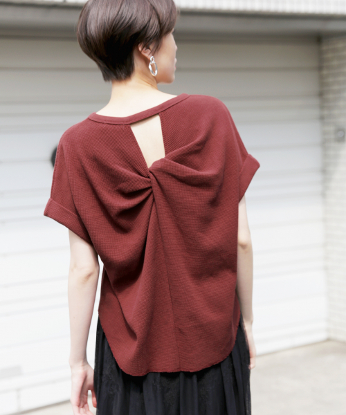 後ろ姿もおしゃれになトップス 前から見るとシンプルなデザインのワッフルTシャツですが、後ろにねじれデザインを施した、トレンド感のあるアイテム!! 後ろに空きを作ることで女性らしさもプラスし、カジュアル過ぎないデザインに仕上げました。 裾を出してリラックススタイルはもちろん、ハイウエストのボトムスと合わせてもバランス良く着て頂けます!