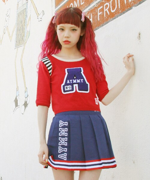 Aymmyらしいスクールチアーズスタイルに欠かせないニット。胸のワッペンがインパクト大。スポーティーなスタイリングの主役に。