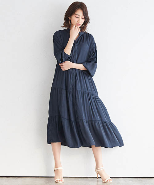 着こなしの幅も広がるトレンドの一枚“ティアードノーカラーシャツワンピース” 【素材】 少しツヤ感のあるマットサテン素材を使用することで、カジュアルにならず上品な雰囲気に。 レーヨン混で滑らかな質感とやわらかな風合いなのも魅力の一つです。 【デザイン】 何段にもなったティアードのデザインが今年旬の一枚。 前は比翼でボタンが見えないデザインになっているので、ワンピースとして一枚やレイヤードで着用するのはもちろん、 前を開けて羽織としても着用できます。 首元はノーカラーデザインなのですっきりとした印象に。