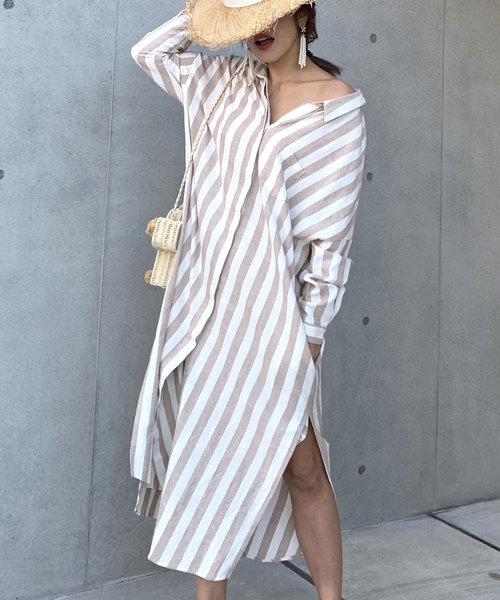 《さらっと羽織るだけでOK!年代や流行りを問わず何年も着られるアイテムです》 一着でスタイリングがきまる! CIEL’AIR定番のロングシャツワンピースの登場です! 大胆なサイドスリットで、レッグラインをちらっと魅せシティー使いはもちろんの事、ビーチやトラベルシーンでも活躍してくれます。 ストライプが縦のラインを強調させ、すらっと着やせ効果もあり◎ バックネックにはリボンが施され、髪をアップスタイルにさせれば、バックコンシャスな一着です。 ビッグシルエットで襟抜きもでき、トレンドムード高めてくれる一着です! かなり深いスリットが入っているので、ショートパンツ、ワイドパンツなどとレイヤードしたスタイリングがオススメです。 ビーチシーンで水着の上にさらっと羽織っても使え、幅広いシーンで活躍してくれる逸品です。 ※一着でそのままワンピースとしても着られる仕様です