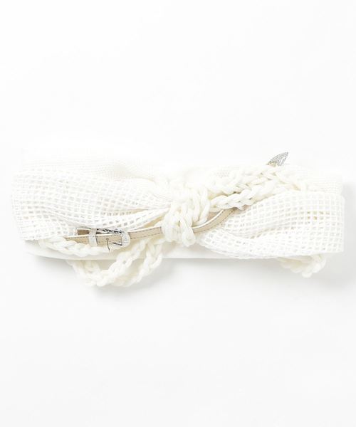 ベルトデザインがポイントのヘアバンド。ダブルバックルのゴージャスなベルトに、軽い雰囲気の手編みニットを組み合わせ、甘すぎないテイストに。それぞれの生地に個性があり、幅広いテイストにマッチします。後ろはゴム仕様になっているため、付けやすくフィット感も◎。