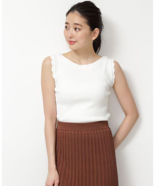 ショルダー部分をミニスカラップで仕上げた、大人可愛いノースリーブカットソー。コットンベースのリブ素材は、優れた伸縮性で程良く体にフィットし着心地◎。上品なゴールド釦を並べたバックデザインが、後ろ姿もおしゃれにアシストしてくれます。コンパクトなシルエットなので、トレンドのロングスカートなどボリュームボトムスとも相性抜群。水洗い可能。