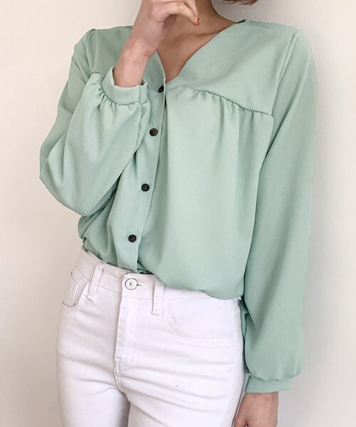 プチプラ¥2,190!ギャザーを入れたVネックが洗練された雰囲気を演出してくれるブラウス。 スラックスやミニスカートにインしてガーリーにまとめるのがオススメ☆ ※WEARに記載してある金額と、DHOLIC通販サイトに記載してある金額にシステム都合上、稀に誤差が生じます。正しい金額はDHOLIC通販サイトに記載された金額です。