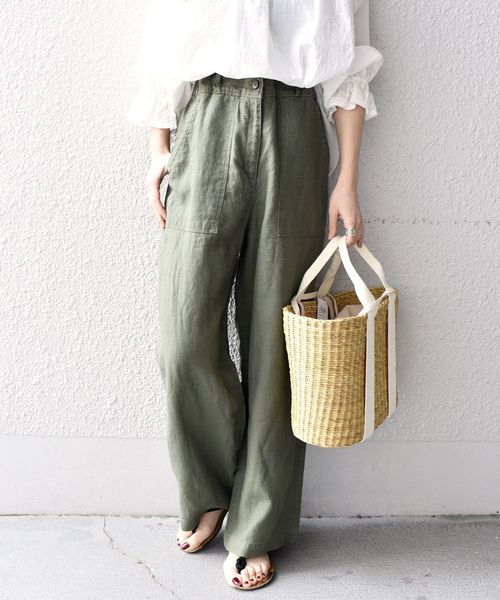 ・・・毎シーズン大好評のリネンパンツ★今年もリニューアルして登場!・・・ リラックス感のあるセミワイドシルエットが魅力のリネンパンツ。フロントに配されたポケットがアクセントになっています。内側の紐でウエスト調節ができ、後ろウエストはゴム仕様なので履き心地も抜群です◎リネンのこなれ感のある素材が大人のカジュアルスタイルにぴったりの一着。家庭洗濯可能なので、これからの季節気軽にご着用いただけるのも嬉しいポイント♪ ※素材の特性上、表面にネップ(部分的に太くなっている)やスラブ(太さにムラがある)などの糸ムラがあります。 ※濃色製品は、着用、洗濯時のスレで表面が毛羽立ち白っぽくなる場合がありますのでご注意ください。 ※濃色製品は、汗や雨等の水分や摩擦により、他の衣類に色移りする場合がありますので、淡色衣類との組み合わせはご注意ください。 ※末永く愛用頂く為に、アテンションタグ・洗濯ネームを必ずご確認の上、着用又はお取り扱い下さい。 ※画像の商品はサンプルです。 実際の商品と色味、仕様、加工、サイズ、素材等が若干異なる場合がございます。