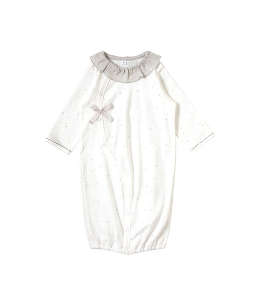 小さめ赤ちゃんのための特別な一枚 ゆっくりと成長をスタートさせた赤ちゃんの、大切な体温を守るために。 小さくお生まれになった赤ちゃんに寄り添う「プリミー」シリーズの2wayドレスです。 【商品説明】 「プリミー」シリーズの役割: 2500g未満でお生まれになった赤ちゃんのデリケートな体に、無理なくぴったりとフィットするよう設計されています。体温保持が必須となる時期の、特別なニーズに応えます。 体温保持の安心感: サイズの合わない大きな衣類では防ぎきれない「冷え」のリスクを避け、小さな命を優しく包み込み、安心感を提供します。 高機能素材: 汗っかきの赤ちゃんにぴったりのファインコットンを採用。吸水性に優れながらも、必要以上の吸い込みを抑える特殊加工により、お洗濯時の負担も軽減されます。 品質と耐久性: 防汚性や洗濯耐久性にも優れており、頻繁なお洗濯にも強く、伸びたりへたったりしにくいため、長く美しくご愛用いただけます。 信頼の日本製:デザインから生産まで一貫した日本製。ベビーの体形に合わせた設計と、国内職人の熟練した技術、そして厳しい安全基準をクリアした高いクオリティをお届けします。 【デザイン】 性別を選ばない上品さ: 小さなシルバーの星を散りばめた、シンプルながらも可愛らしいユニセックスデザインです。 便利な2way仕様: 足元のボタンの留め方を変えるだけで、おむつ替えがしやすいドレスオール(ワンピース型)と、活発に動く時期に便利なショートオール(カバーオール型)の2通りで楽しめます。 着心地へのこだわり: オールシーズン快適にお使いいただける、肌触りのなめらかなフライス生地を採用しています。 【使用シーン】 記念の退院時に: 星のモチーフが華を添え、退院時のセレモニードレスの代わりとしてもふさわしい、特別な一枚となります。 心遣いのギフトに: 贈る相手を選ばない洗練されたデザインと、小さく生まれた赤ちゃんの健やかな成長を願う気持ちが伝わる機能性から、出産祝いに最適です。 日常の快適さに: 吸水性と耐久性に優れた素材のため、日常のお着替えや日々の体温調節にも安心してご活用いただけます。 【素材】 生地:コットン100% なめらかで肌触りの良いファインコットン 【サイズ】 45〜60cm 【生産国】 日本製