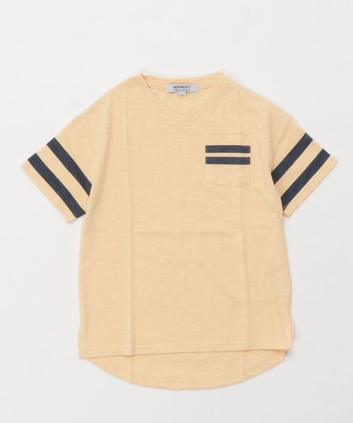 UNDERWRAPS(アンダーラップス)から、スラブ天竺素材のガールズTシャツが登場しました☆Vネックで裾は前後差のある仕様の大人カワイイ、アメカジガールズTシャツです。袖とフロントポケットにあるラインプリントがアクセントになっています♪