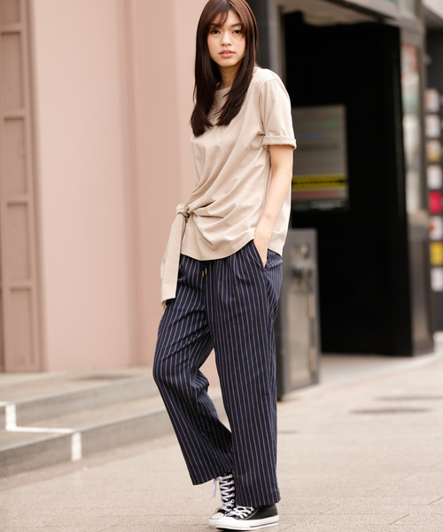 2019 SS NEW ARRIVAL ◆サイドにリボンをあしらった整えいらずのカットソー◆ <MATERIAL> 毛羽が少なく、洗いざらしの風合いとドライなタッチな質感が特徴のカットソー素材になります。 毛羽を入れ込みながら紡績をする事により、抗ピル性(毛玉になりずらい)があり、シャリ感が出てドライタッチな風合いで吸湿性も優れているのが特徴です。 さらに粗野な風合いに仕上げる為、まるで天日干しをしたかの様なカラッとした表情にしたのもこの生地の特徴です。 また、度詰めに目の詰まった編み立てにする事で、しっかりとした素材感とハリ感を出し、肌離れも良く暑い時期でもさらりとした着心地の良さがある素材感です。 <DESIGN> 甘辛MIXのバランスが可愛いデザインTシャツです。 オーソドックスなTシャツの右サイドにリボンを付けてアクセントにしたデザインプルオーバーです。 ほんのりとビッグシルエットにすることで、リボンディテールの甘さを程よくおさえて大人っぽい上品なデザインに仕上げました。 リボンはラフに固結びするだけで、自然にブラウジングしたようなドレープが出るので、着用時に着崩れしにくく、整えて着る必要はほとんどありません。 袖丈は腕が細見えする肘下丈で、さりげなく二の腕をカバー。袖口をロールアップして着ても素敵です。 着丈も長めでお腹周りもカバーしてくれて、リボンのディテールが縦長ラインを作りだしてくれます。 Tシャツの着心地はそのままに、”こなれた着こなし”をこの一枚で叶えてくれる優秀アイテムです。 オンの時のTシャツはNGという方でも、そのお悩みを解決してくれるのはこのディテールが成せる技です。 パンツ合わせがバランスもとりやすくリボンディテールがより引き立ちますが、タイトスカートなどあえて女性らしいボトム合わせで上品カジュアルな着こなしもおすすめです。 <COLOR> ■ホワイト:真っ白に近いクリアなホワイトです。透け感も気にならないホワイトで着回し力の高いお役立ちカラーです。 ■ベージュ:ほんのり色づく優しい色みのベージュです。合わせる色を選ばない万能からーです。 ■ネイビー:通常の明度のネイビーです。着やせ効果の高い人気のカラーです。 ■ラベンダー:パープルより落ち着いた大人カラーのラベンダー。すっきりとした上品な印象のカラーです。 *お取扱いについては、商品についております品質表示にてご確認ください。 洗濯:洗濯機使用可 .............................≪INFORMATION ≫............................ ▼商品のお気に入り登録▼ 『♡』マークを押してお気に入り登録して頂いた商品は、セール開催の通知やクーポン発行などの キャンペーンなど、お得な情報をいち早く受けとる事が出来ますので、ぜひご登録ください。