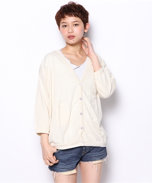 レーヨン混のしなやかで肌触りのよい素材でのカーディガン。ドロップした肩で、着用しやすい7分袖のゆるカーデです。よく見るとポットとティーカップになったポケットが。ステッチ風のプリントもこだわりです。 model:H161 B80 W58 H89 着用サイズ:03