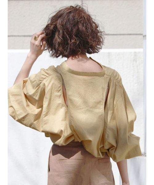 【特徴】 バックスタイルにデザインを施したデザインブラウス。 モダンな雰囲気で抜け感のあるデザインが斬新な1枚。 袖のたっぷりとしたボリューム感でスタイリング映えする1枚です。 【スタイリングポイント】 タックパンツとスタイリングしてモダンな雰囲気でまとめるのがオススメ。 足元はヒールサンダルがオシャレに決まります。