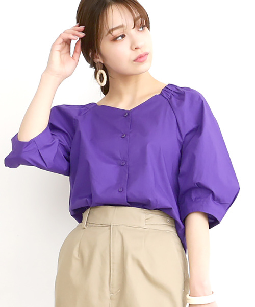 さっぱりとしたコットン素材のスクエアネックブラウス。鎖骨がきれいに見えるスクエアネック、ぽわっとふくらみを持たせた六分袖がデザインポイントです。 肩にゴムが通っているので自然とギャザーもついて可愛らしいニュアンスが出る仕上がりです。 首の後ろも開けてバックスタイルも抜け感がでる見え方です。 ボトムインする着こなしがお勧めです。