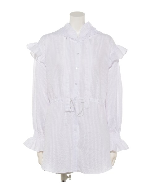 爽やかなシャツベースで、ロングシーズン装えるフーデッドジャケットです。肩口などにあしらったフリルが、女性らしい甘いムードを注ぐポイント。ウエストはドローストリングでキュッとシェイプできるので、ヒップまで掛かる着丈もスマートにまとえます。