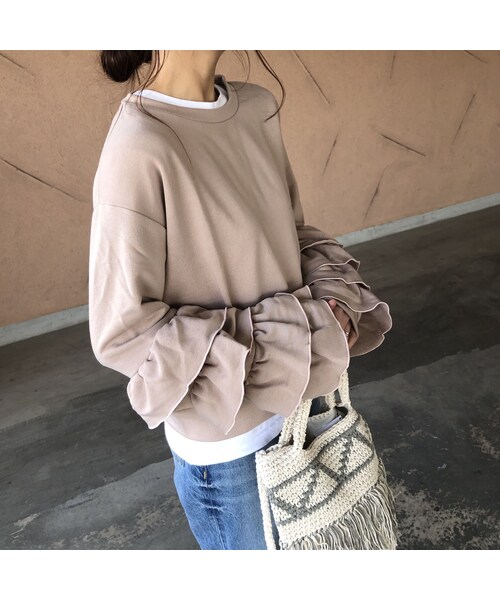 くすみカラー♡お袖にフリルをあしらった大人可愛いトレーナー。 レイヤードしやすい着丈と落ち着いたカラー展開でスタイリングしやすいのもポイント! デニムカジュアルはもちろん、スカートでレディライクに着たりと幅広いコーデをお楽しみ頂ける一押しアイテムです☆ ※モデル身長:161㎝ ◆クリックポストにて代引きをお選び頂いた方は、390円プラスさせていただき、ゆうパックの代引きにて発送させていただきますのでご了承下さい。 ◆カラー アイボリー・くすみピンク・グレー ◆サイズ 着丈:53cm 肩幅:50cm 袖丈:52cm 袖口:10cm 裾巾:47㎝ ※多少の誤差は予めご了承ください。 ◆素材 ポリエステル 100% ※こちらの商品は新品ですが素材状、はじめから多少毛玉・毛羽立ちがございますが、不良箇所ではございませんので予めご了承の上お買い求めください。