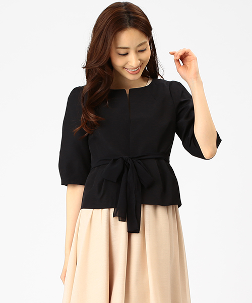 ハリ感がありしっかりとしたコットン・シルク混紡のグログラン素材を使用。シルクの光沢感がエレガントな雰囲気をかもし出す、上品テイストのボレロジャケットです。コンパクトなボディにコクーンスリーブのたっぷりとしたボリューム感、裾の優美なぺプラムがアクセント。ウエストにほどこしたリボンが華やかさをプラスします。 パーティーワンピースにさらりと羽織って。リボンは取り外しが可能なので、シンプルなジャケットとしても活躍します。 【メイン画像】 Model : H167 B80 W58 H83(cm) Size : 38 【詳細画像】 Model : H170 B78 W58 H86(cm) Size : 38 店舗へお問い合わせの際は下記品番をお伝えください。 品番:68-16-0058-002