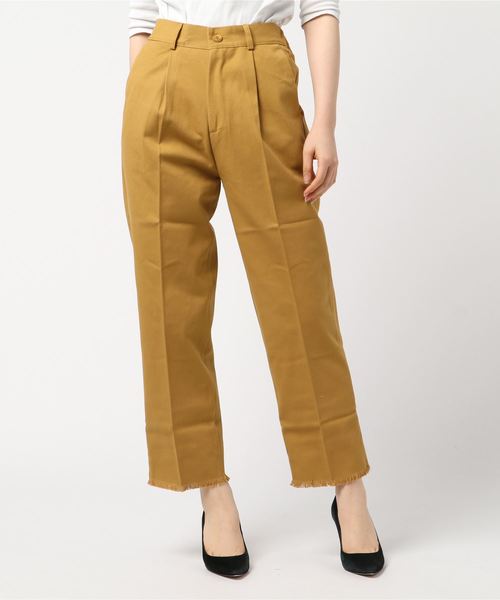 使いやすいカジュアル素材ながら、きれい見えが叶う優秀パンツ☆ 少し細身のテーパードのかたちにセンタープレスを入れている為、着用した際に立体感が出て美脚効果抜群です。 裾にはフリンジを施してポイントに。 スタイリングにラフな雰囲気をプラスしてくれるので、甘めなブラウスをカジュアルダウンしたい時にぴったり! Tsやサーマルなどリラックス感のあるアイテムとのスタイリングもおすすめのです。 ☆WHTのみショート丈の裏地付きです。
