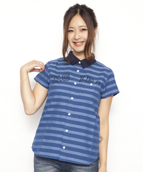 配色の衿がポイントのダンガリーとボーダー4色展開で、夏まで着られるカジュアルな半袖シャツ。ポケットを後から付けたようなリメイク風デザインに★