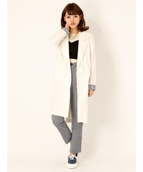 ロング丈のチェスタージャケット。軽くてさらりと羽織るのに便利アイテム。袖の裏地にストライプなので折り返して見せてカッコよく着こなして欲しい1着です。model:H161・B83・W56・H84中国製