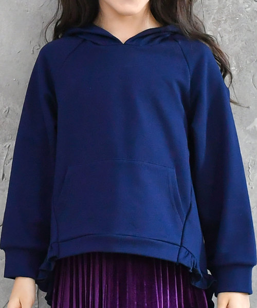 アシメ裾が他には無いデザインのパーカートップス! カジュアルなパーカー×アシメ裾フリルがとってもキュート! 動き回りやすい形でアクティブなお子様におススメ!