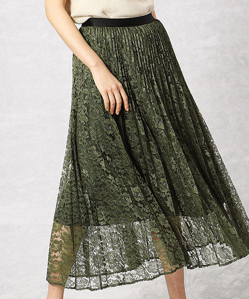 《デザイン》・シアー感が涼しげな、レースプリーツスカート。・ヒップからウエストにかけて、プリーツの本数を倍にして、ゆるやかに体に沿うシルエットです。・ウエストはゴム仕様で、快適な履き心地。《素材》・光沢のない糸、光沢のある糸、やや太い糸を使って、陰影のある繊細な花柄レースをラッセル機で編み上げています。・ご家庭で手洗いでのお洗濯が可能。