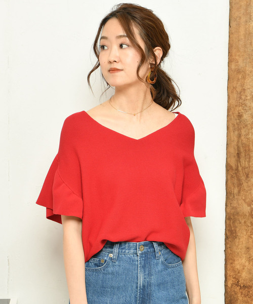 シンプルなVネックに袖のフリルが女性らしいアクセントになるプルオーバー。程よく張りのあるニット生地でボディラインを拾わず、リラックス感のある着心地になっています。柔らかな肌触りの素材も魅力ポイント。キレイめからカジュアルスタイルまで合わせやすい1枚です。