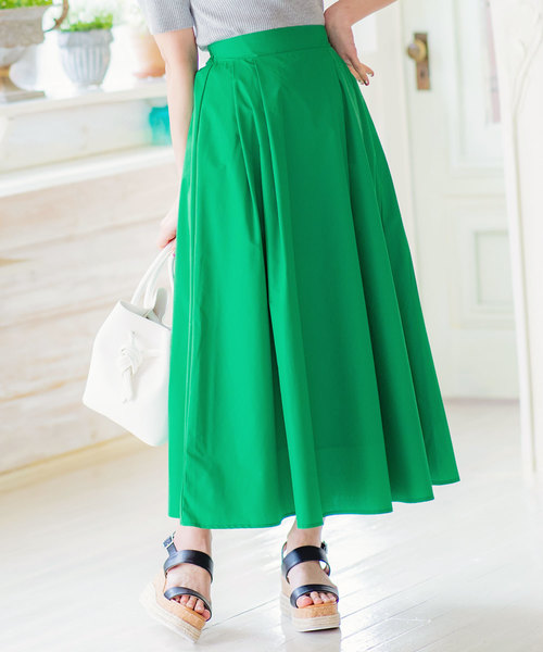 タック入りでボリューム感が可愛いマキシ丈スカート。ウエストのタックから広がり過ぎない美しいシルエットが魅力のひとつ。大人の履きやすい長めの丈感がワードローブに加えたい一品です。 春夏らしいカラー展開で、コーディネートのアクセントに。 【素材・サイズ感】ほのかにハリ感のある薄手のさらりとした綿混素材。贅沢に分量を使っているのに重たくないのも◎ウエストはバックゴム仕様でウエストINもすっきりとしたシルエットに。 【スタイリング】Tシャツ等シンプルなトップスをあわせるだけで大人っぽく様になるアイテム。コンパクトなトップスと相性バツグン。レディからカジュアルまでコーデの幅が広がります。 裏地有りです。