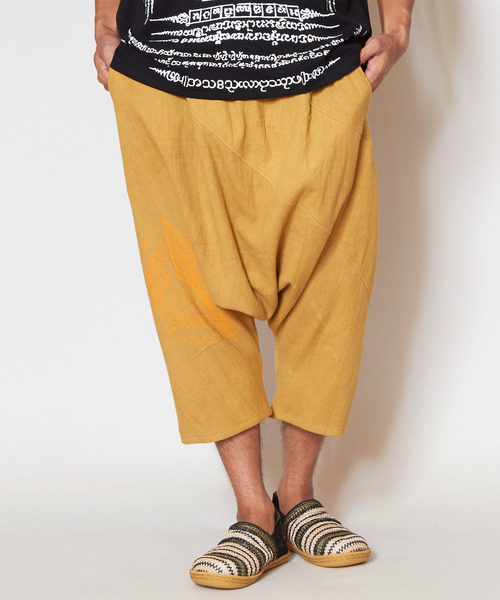 無地ライクに穿ける変形メンズサルエルパンツ。 右サイドには北欧神話の神・オーディンが持つ槍「グングニル」をモチーフにしたプリントを入れました。 生地の斜めの切り替えが斬新で、ポケット位置もとてもユニーク!ディテールにこだわったデザインです。 一味違ったフォークロアスタイル・エスニックコーデに◎。 ※こちらの商品は1点1点職人による手作りとなります。その為、形や色合いなど若干異なる場合がございます。あらかじめご了承ください。 Amina Collection Co.,LTD.