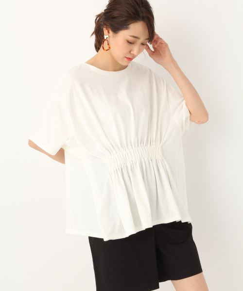 嬉しい接触冷感機能付き!清涼感のあるサラッとした肌触りの接触冷感機能素材の前後2WAY型デザイントップス。たっぷりとギャザーをあしらったウエストデザインはトレンド性が高い上にお腹周りも気にすることなくオシャレに決まります!ギャザーを後ろ側にして着るとふんわりとしたシルエットがバックディティールを美しく魅せてくれます♪