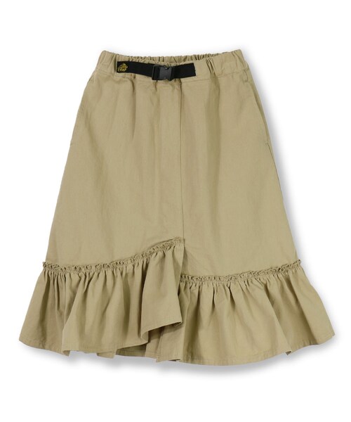 今年注目のアウトドアテイストを女の子らしく落とし込みました。マウンテンスカート風のチノスカートにマーメイドの切り替えをプラスし、アシンメトリーにデザイン。動きやすいように少しけ回しは広めにとっています。ベルトをいかしたタックインのスタイリングがおすすめです。