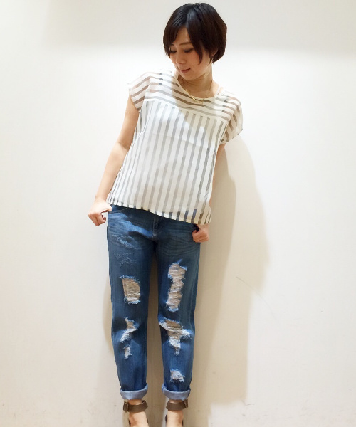Discoat(ディスコート) カジュアルダウンアイテムとして人気のダメージデニム☆コーデしやすいブルーデニムでデイリーにお使いいただけます。ゆるシルエットでスタイルアップも期待でき、こなれ感も実現☆ model:H170 B81 W65 H88 着用サイズ:MEDIUM
