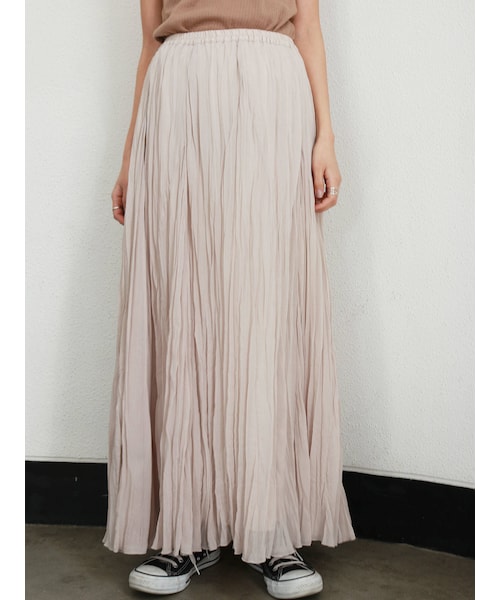 クリンクル加工を施したマキシスカート。粗野な素材感とランダムなシワ感が絶妙にミックスした1枚に。カラーもデイリーに着まわしやすいラインナップです。【スタイリング】ボリューミーなカットソーやカジュアル感のあるトップスがマッチします。足元はスニーカーでカジュアルなムードで。