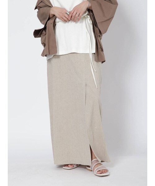 ストレッチ素材を使用したマキシスカート。少しシワ感のある素材なのでラフな仕上がりに。きれいめなシルエットですがストレッチが入ることで履きやすくデイリーに着回ししたい1枚。深めに入ったスリットはモダンなムードでシティライクに合わせて頂けます。【スタイリング】デザインカットソーと着合わせて今季らしいモダンなスタイリングがオススメ。足元はサンダルで少しラフなムードでまとめるとお洒落です。