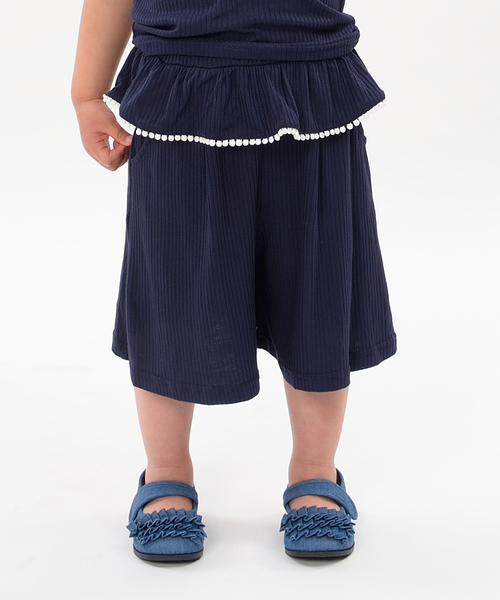 たっぷりのフリルがフェミニンな雰囲気のワイドパンツ。フリルの裾には小さなボンボンが付いているのもポイントです。表面感のあるサッカー天竺素材で、さらっと履き心地も良いです。膝が隠れる6.5分丈です。同じデザインでキッズTシャツ(G40804)とお揃い・ペア・リンクコーデが楽しめます♪キッズTシャツ(G40804)とセットアップもオススメです☆ ウエストゴム有りです。