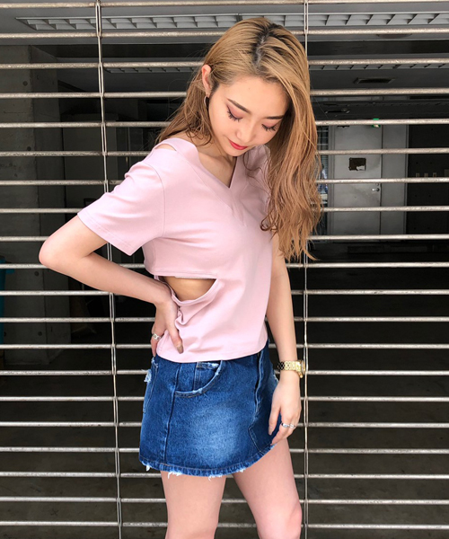 定番ボトムス合せでも、一歩差の付くオシャレが楽しめる小悪魔Tシャツです。 深い襟開きのVラインも、顔周りをシャープに見せヌケのある着こなしをメイク