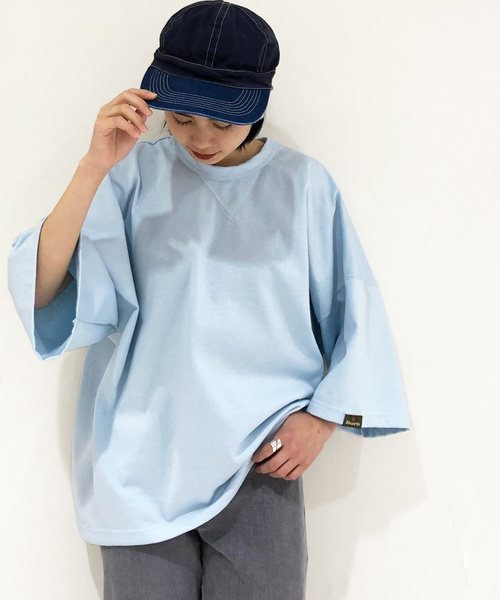 しっかりした風合いのコットン生地を使用したワイドTシャツです。 ヒップにかけてラウンドした裾が、腰回りをすっきりと見せてくれます。 彼に借りたような大き目のサイズ感がラフに着用して頂け、程よい抜け感を演出してくれます。 ヴィンテージスウェットをモチーフにしたネックのガゼットがアクセントになっています。