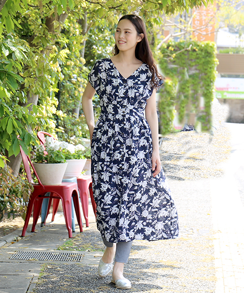 フラワー柄ーが鮮やか夏らしい日差しを感じるエンパイヤーワンピース!この春夏人気のエンパイヤー型ワンピは バストした切り替えの脚長効果と華奢魅せ効果の抜群デザインでスタイルアップに◎お出かけしたくなるような素敵なフラワープリントは日差しに映え街中でもバカンスでも ツイ撮影したくなる映えワンピです。コーデも楽しくできそう!羽織りに使って◎レギンスで 少しカジュアルにワンピでスッキリきれい鎖骨ライン首元を出して女性らしいコーデをスニーカーとサンダル パンプスコーデもめいっぱい楽しめます。生地は程よいハリがありワンピースのキレイなラインがだせます。