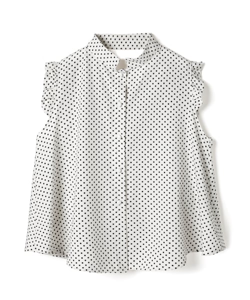 CUTEな水玉柄のノースリーブシャツが登場。 袖口に配したフリルがたまらなくガーリー。 背中開きデザインで後ろ姿に大人っぽさをプラス。 スタンドカラーできちんと感を演出しつつ、センシュアルな意外性を併せ持つアイテム。 さらりとシンプルなボトムとコーデするだけで今年らしく決まるアイテム。 ★裁断の関係で、柄の出方が写真と多少異なる場合があります。