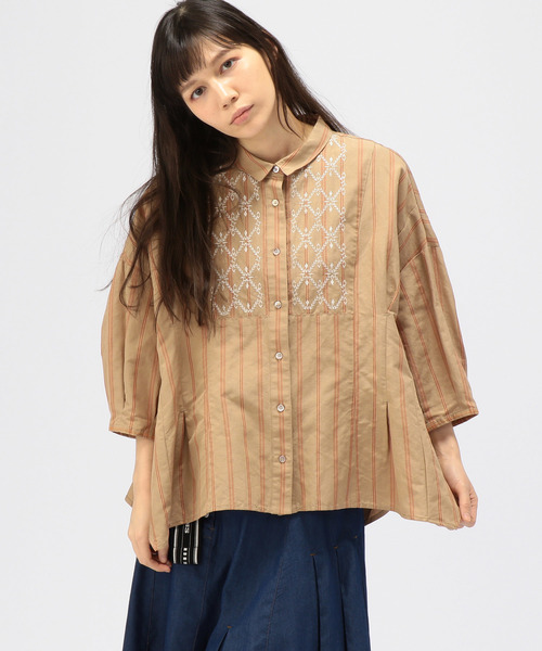 麻混のしっかりとしたヴィンテージ感のある色合いのストライプ生地。胸元に手描きで描いたオリジナル刺繍を施した、デザインブラウスです。