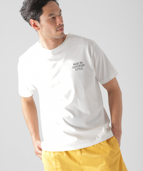 吸水速乾機能のあるTC素材にピグメント染めで味のある表情を足しました。 胸元のワーカーシャツ風メッセージがポイントです。