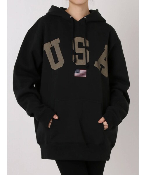USAビックロゴが今年らしいカジュアル派にぴったりのフーディー。ヒップがすっぽりと隠れるほどのサイズ感が楽ちんに着ていただけるポイント。スキニーでボーイッシュに、ミニボトムを合わせれば一気に女性らしい着こなしへと変身します◎